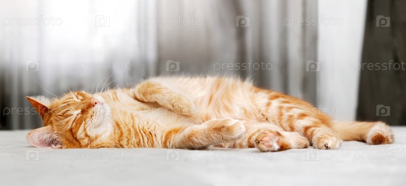 Портрет рыжего кота, лежащего на кровати и спящего. Мелкий фокус