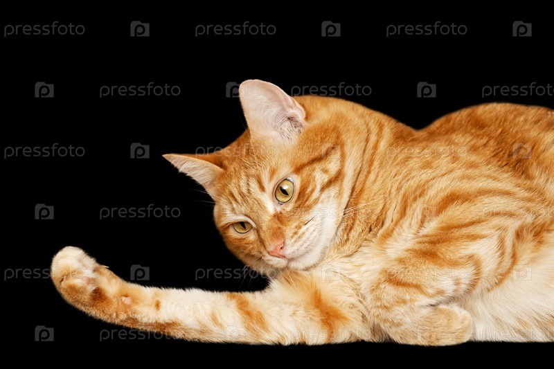 Крупным планом портрет рыжего лежащего кота на черном фоне