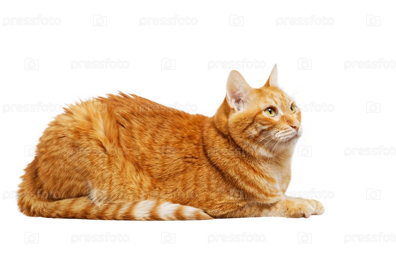 Портрет лежащей рыжей кошки на белом фоне