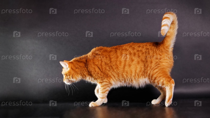 Бегущий рыжий кот на черном фоне. Копипространство