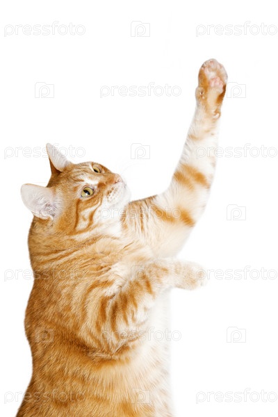Крупный план рыжего кота поднимает лапу и смотрит вверх. Изолированные на белом фоне