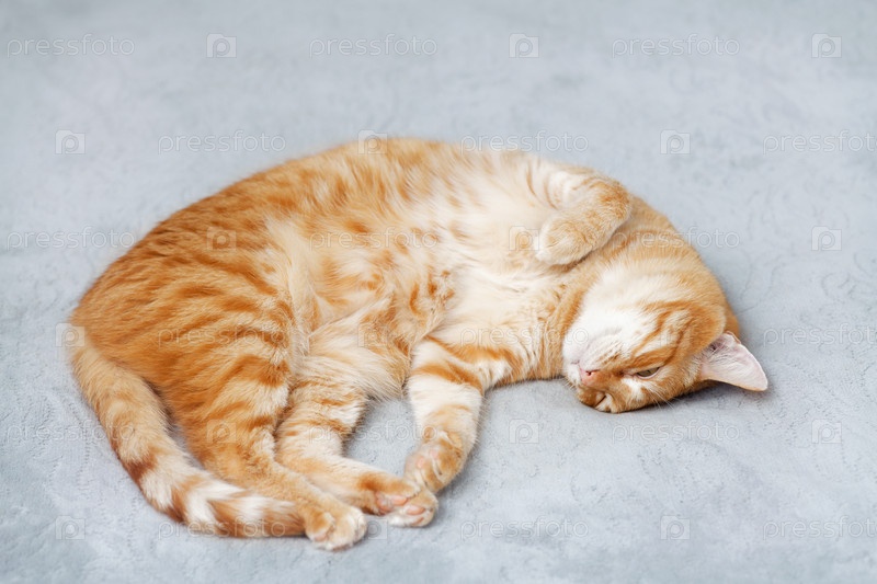 Рыжий кот лежит на кровати. Мелкий фокус