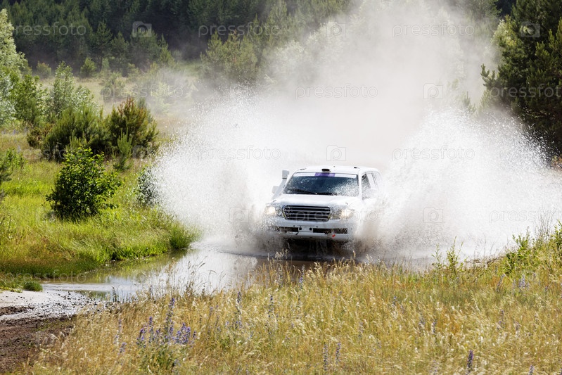 Полноприводный автомобиль преодолевает водную преграду на большой скорости в окружении брызг и брызг