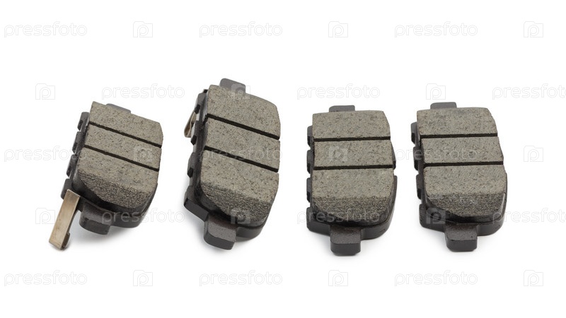 Набор новых тормозных колодок для автомобиля, изолированные на белом фоне с тенью. Мелкий фокус