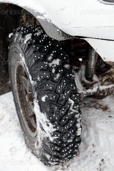 Зимнее колесо крупным планом с железными шипами для грязи и снежной местности