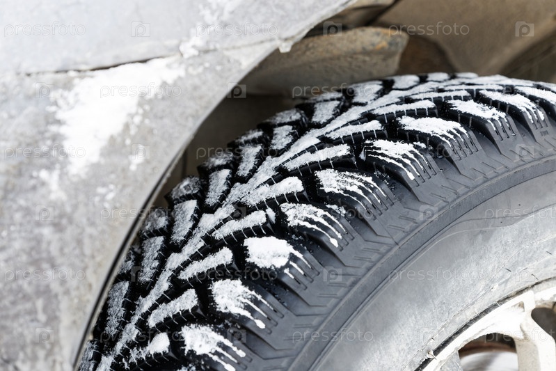 Зимнее колесо крупным планом с железными шипами для грязи и снежной местности