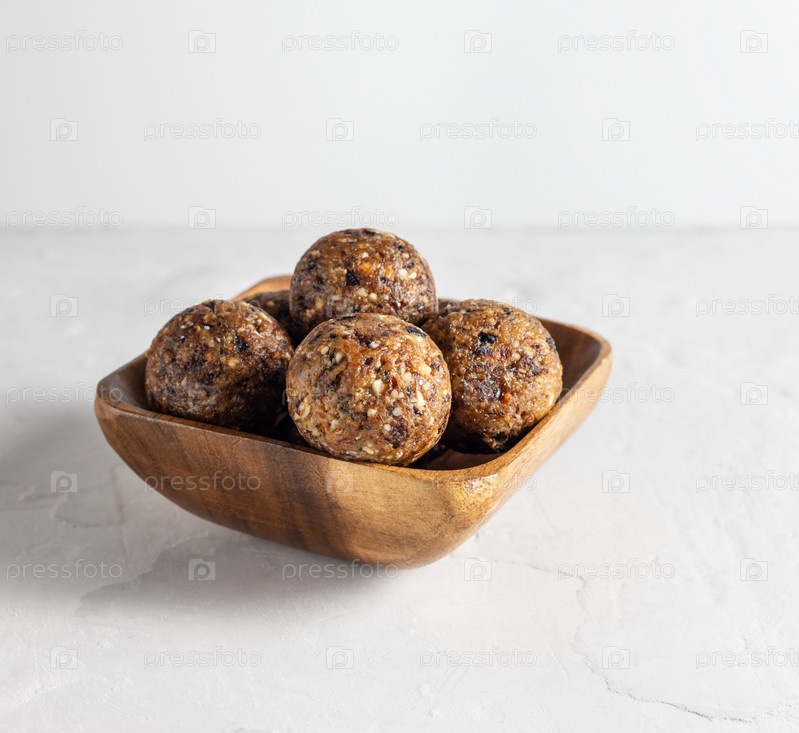 Домашние энергетические шарики с финиками, черносливом, миндалем. Здоровая сладкая еда. Энергетические шары в деревянной миске на белом фоне