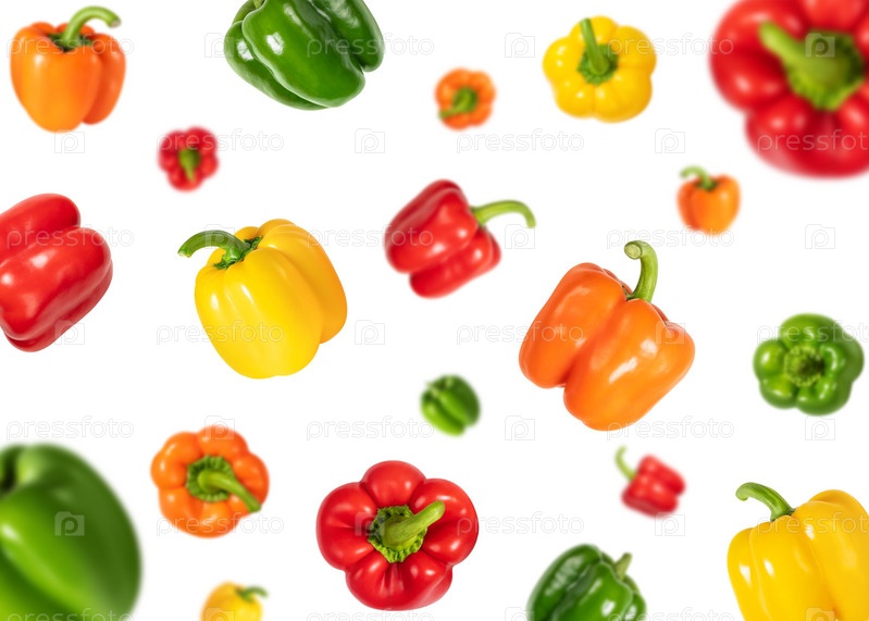 Набор с летающими красочными сладкими перцами, изолированными на белом фоне. Падение болгарского перца. Шаблон овощной мухи