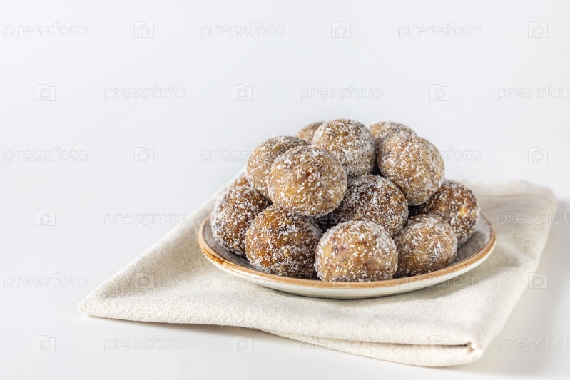 Здоровая сладкая еда. Энергетические шары в тарелке на белом фоне
