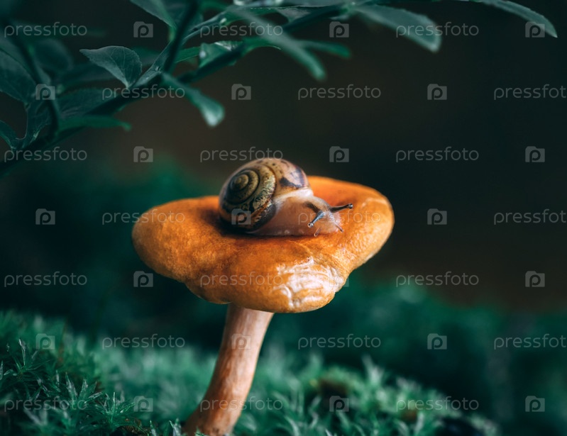 Маленькая любопытная улитка на оранжевом грибе лисички во мху. Волшебный лес. Съедобные грибы. Макрос крупным планом, зеленый размытый фон