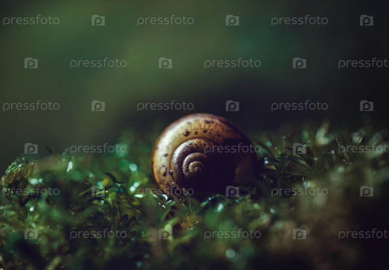 Красивая раковина улитки на темно-зеленом фоне крупным планом. Спираль раковины в влажном мхе, макросе. Мрачная загадочная картина. Желто-зеленый мох на закате