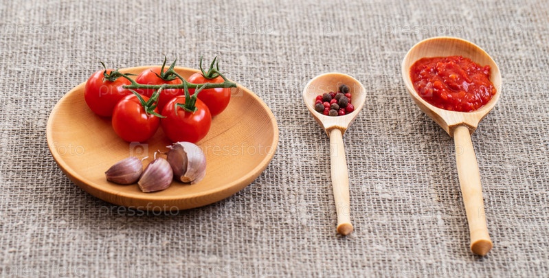 Помидоры черри в деревянной тарелке на сером фоне. Продовольственный фон. Соус аджика, красный и черный перец в ложках на мешковине. Вид сбоку, фото еды, деревянная посуда. Соусы и специи