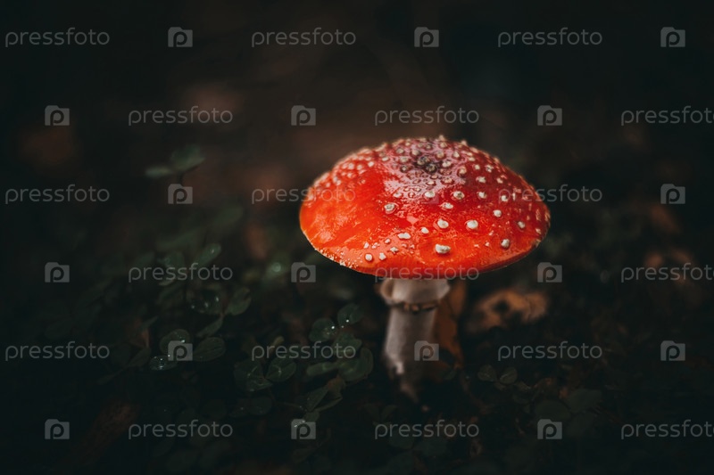 Красный мухомор на темном фоне в лесу. Ядовитый гриб. Макро. Гриб с красной шляпкой с белыми точками на белой ножке. Мухомор после дождя. Осенний лес. Капли росы на траве