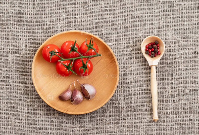 Помидоры черри и чеснок в деревянной тарелке, красный и черный перец в ложках на мешковине. Продовольственный фон. Фото еды сверху, деревянная посуда. Плоская планировка