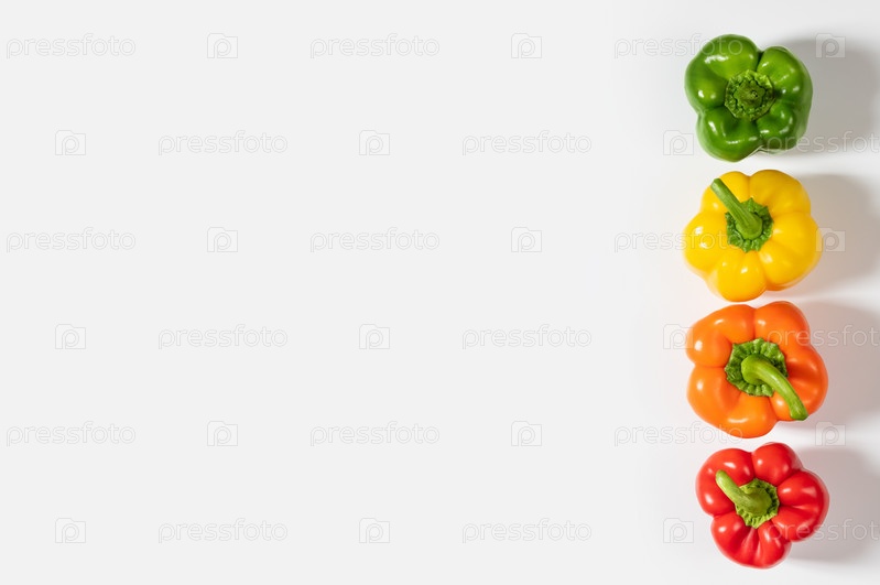 Цветные болгарские перцы на белом фоне. Зеленый, желтый, оранжевый и красный перец. Концепция еды