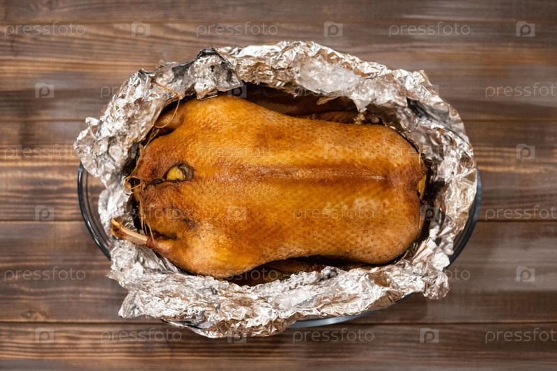 Еда в фольге. Утка с яблоками, запеченными в фольге на коричневом деревянном фоне. Вкуснейшее мясо птицы с румяной корочкой