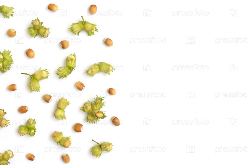 Ореховая граница. Фундук с зелеными листьями, изолированные на белом фоне. Свежие органические орехи. Копировать пространство