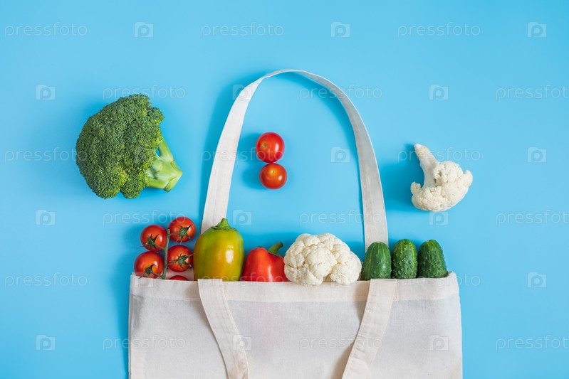 Концепция нулевых отходов. Овощи в экологически чистой многоразовой текстильной сумке на синем фоне. Без пластика. Здоровая свежая вегетарианская еда