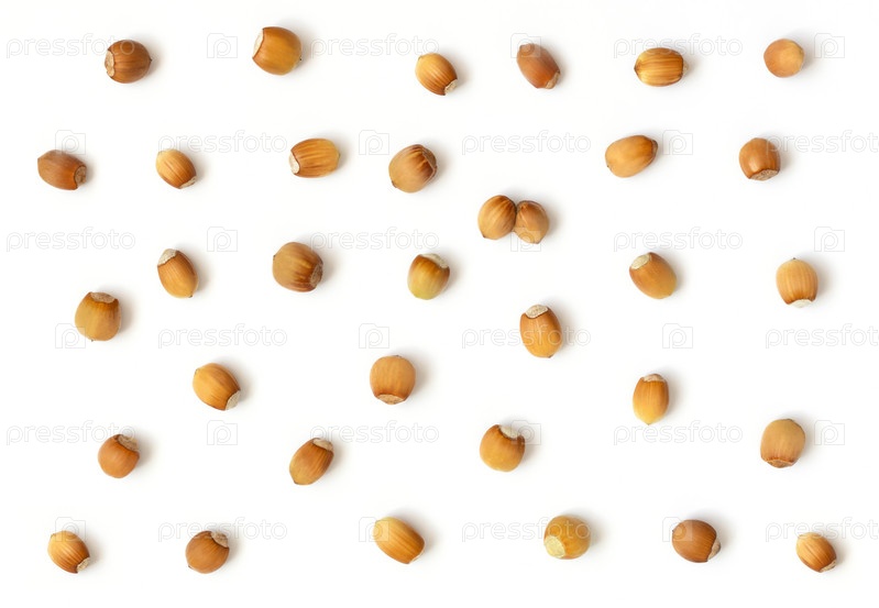 Ореховый узор. Орехи, изолированные на белом фоне. Свежий спелый фундук. Вид сверху, плоская планировка