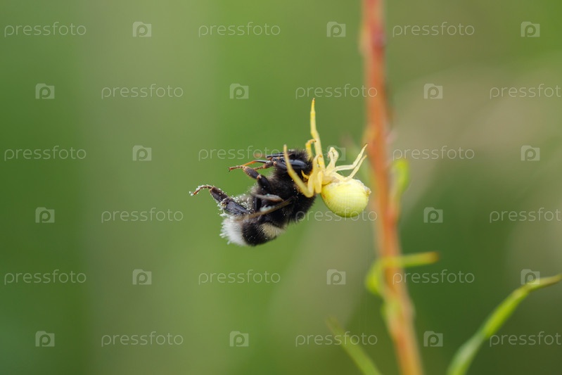 Паук поймал пчелу. Краб-паук, мисумена ватия с крупным планом добычи на зеленом фоне. Цветок, имитирующий крабового паука. Желтый паук напал на пчелу