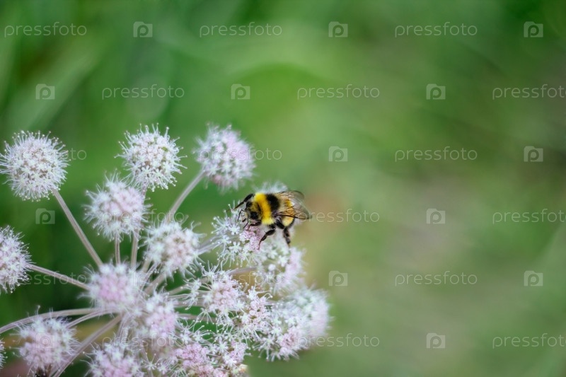 Пушистый полосатый шмель сидит на ядовитом белом цветке водяного болиголова на зеленом фоне. Текстурированные крылья. Закрыть. Ядовитое растение