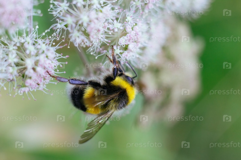 Пушистый полосатый шмель сидит на ядовитом белом цветке водяного болиголова на зеленом фоне. Текстурированные крылья. Крупный план, вид сбоку. Ядовитое растение