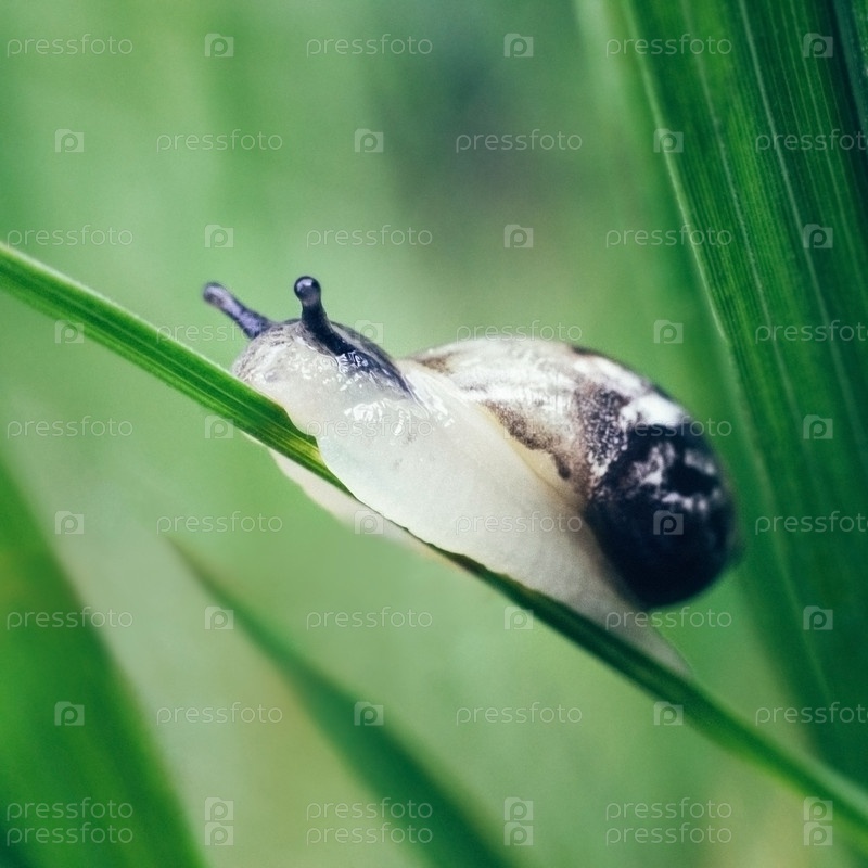 Маленькая белая улитка на зеленом фоне крупным планом. Улитка с черной раковиной ползет по травинке. Макро. Яркая трава в летний день