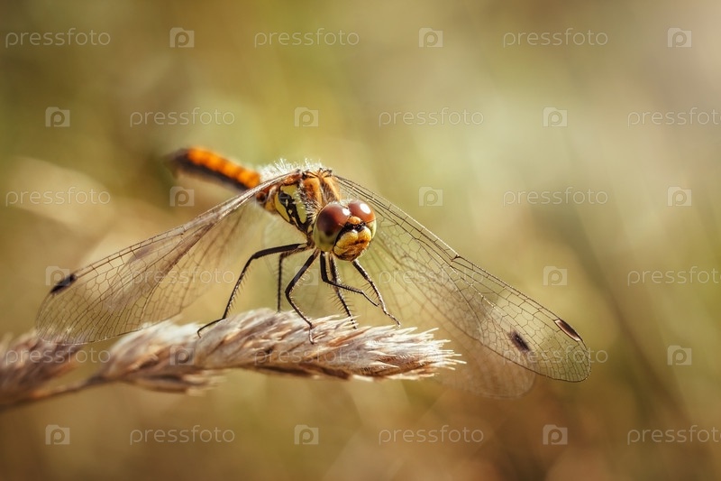 Красивая оранжевая стрекоза на жёлтом фоне с крупным планом. Sympetrum sanguineum, красная стрекоза, красный симпетрум, красная змея. Стрекоза отдыхает на сухой траве, макро. Хищное насекомое