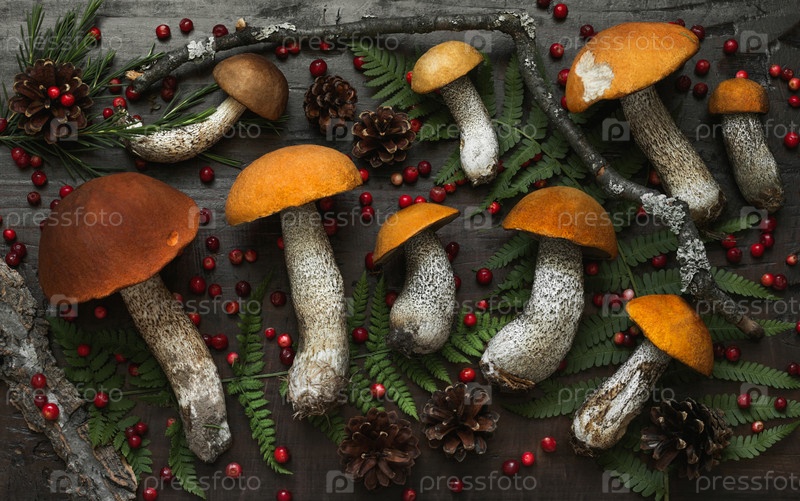 Фон лесных грибов. Осиновые грибы, красные ягоды и шишки на темном деревянном фоне. Осенняя композиция. Урожай леса. Вид сверху, плоская планировка