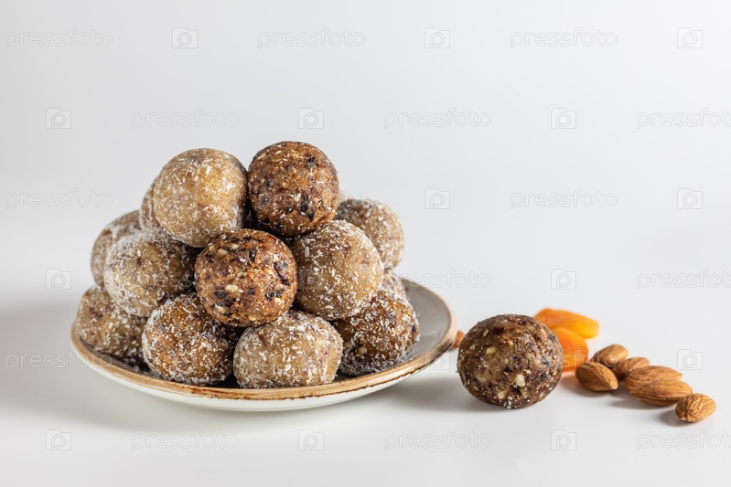 Домашние энергетические шарики с курагой, изюмом, финиками, черносливом, грецкими орехами, миндалем и кокосом. Здоровая сладкая еда. Энергетические шары в тарелке на белом фоне