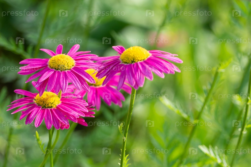 Цветущие розовые ромашки в саду. Естественный фон весенние цветы. Ярко-розовые цветки маргаритки растут в саду