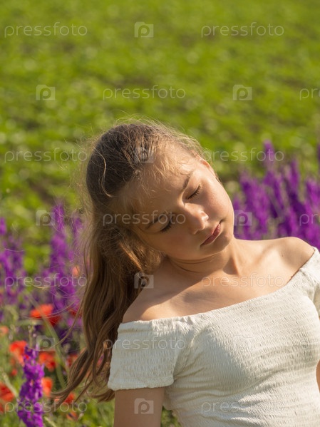Девочка-подросток с длинными волосами проводит свободное время летом на природе среди цветов и наслаждается свободой, она счастлива, ее глаза закрыты