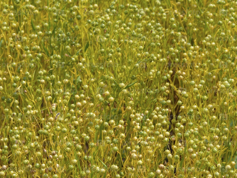 Созревание льна в поле крупным планом (льняное растение). Ящики из льна обыкновенного с семенами льна – естественный зеленоватый фон. Зеленые льняные капсулы растут на зеленом фоне