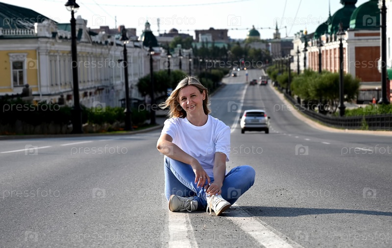 Уверенная в себе молодая женщина ходит по улицам города, женщина улыбается и наслаждается жизнью