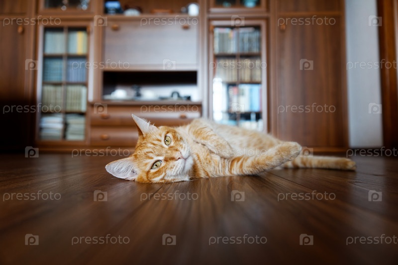Рыжий кот лежит дома на деревянном полу. Мелкий фокус