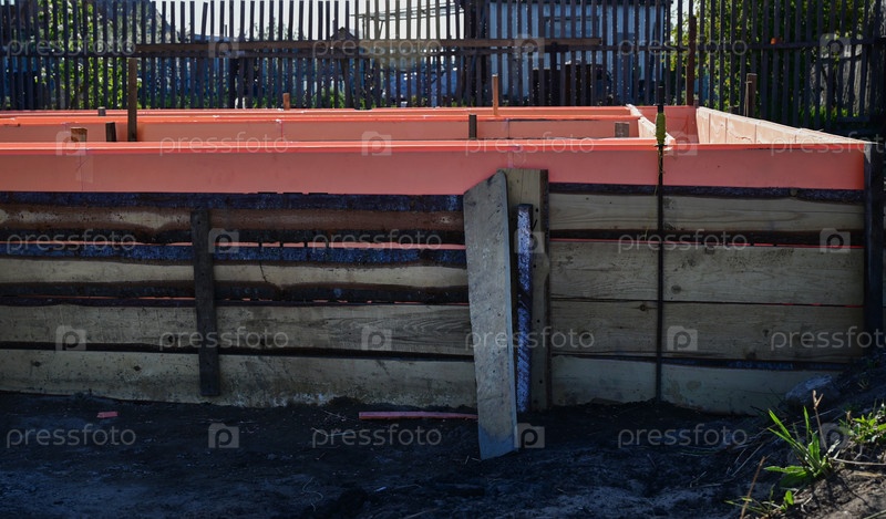 Деревянная опалубка с металлической арматурой, подготовленная для заливки бетона. Монтаж с помощью проволоки. Строительство нового дома