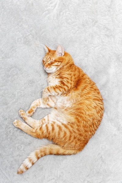Рыжий кот лежит и спит на кровати. Вид сверху