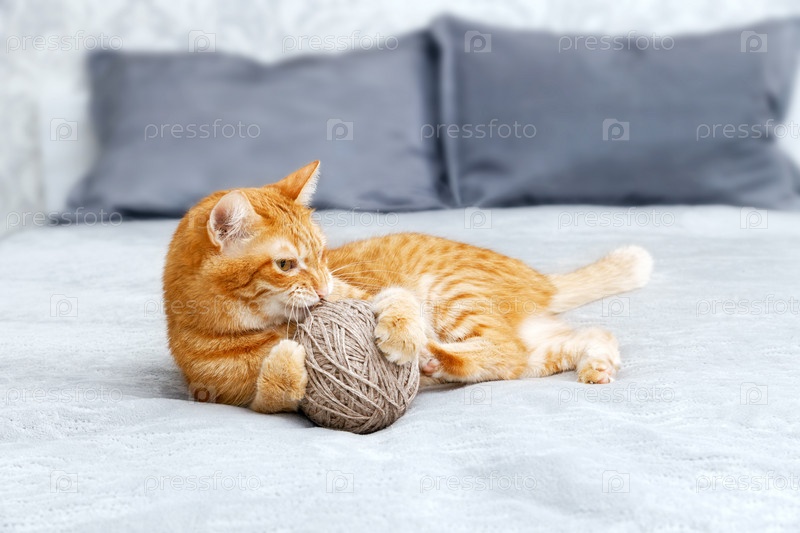 Оранжевый кот играет с клубком пряжи, лежащим на кровати. Мелкий фокус, размытый фон