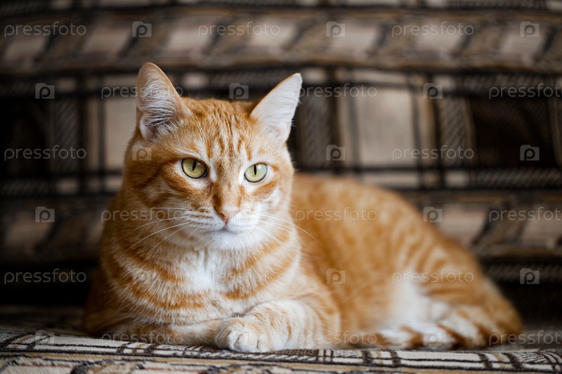 Домашняя рыжая кошка лежит на диване. Мелкий фокус