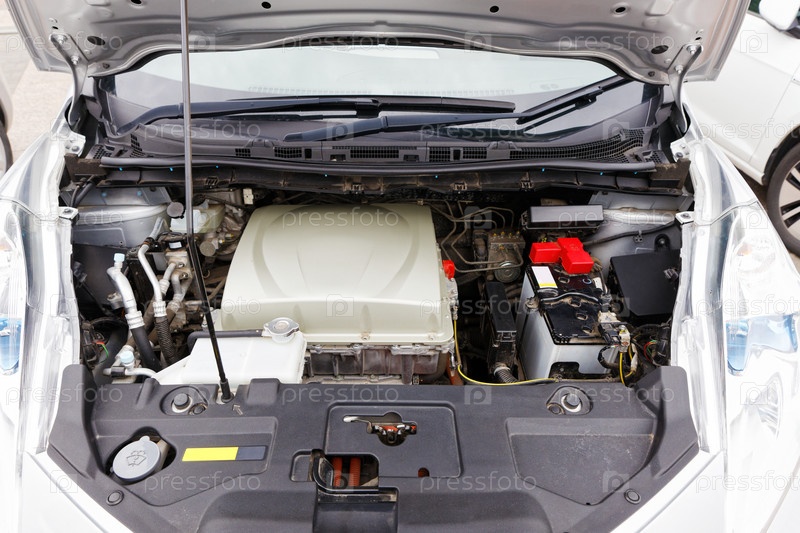 Крупный план электромобиля под открытым капотом. Передний план