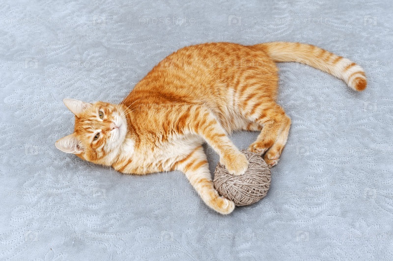 Оранжевый кот играет с клубком пряжи, лежащим на кровати. Мелкий фокус