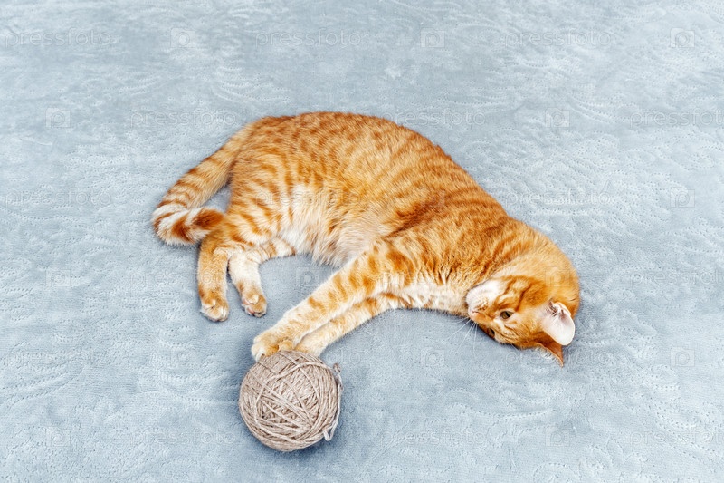 Оранжевый кот играет с клубком пряжи, лежащим на кровати. Мелкий фокус