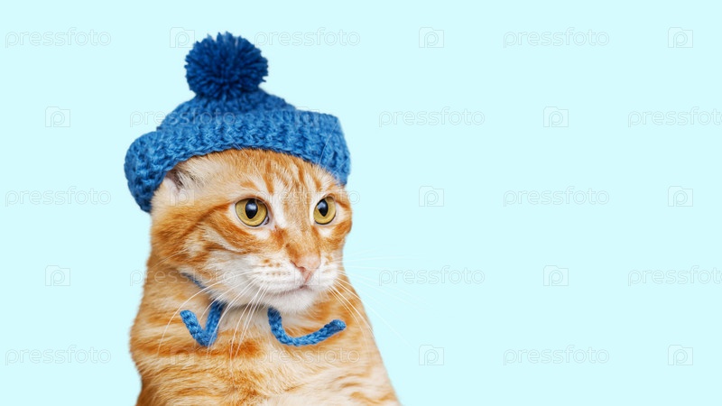 Портрет крупным планом смешного рыжего кота в синей вязаной шапке с помпоном, изолированным на светло-голубом. Копипространство