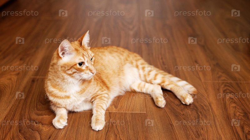 Рыжий кот лежит на деревянном полу. Угловой вид. Мелкий фокус