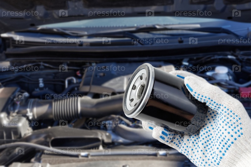 Автомеханик держит в руке масляный фильтр для замены и двигатель автомобиля на размытом фоне. Мелкий фокус