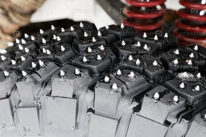 Зимнее колесо крупным планом с железными шипами для грязи и снежной местности
