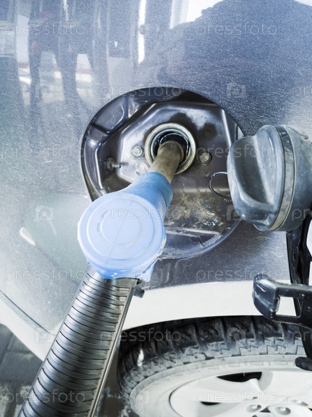 Автомобиль на АЗС заправляется топливом. Закройте заправочный пистолет в горловине бака