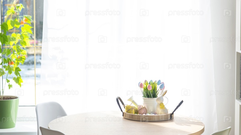 Пасхальное украшение из разноцветных яиц, свежая трава в лейке, пасхальный кролик на подносе на круглом столе в деревенском стиле. Праздничный интерьер загородного дома