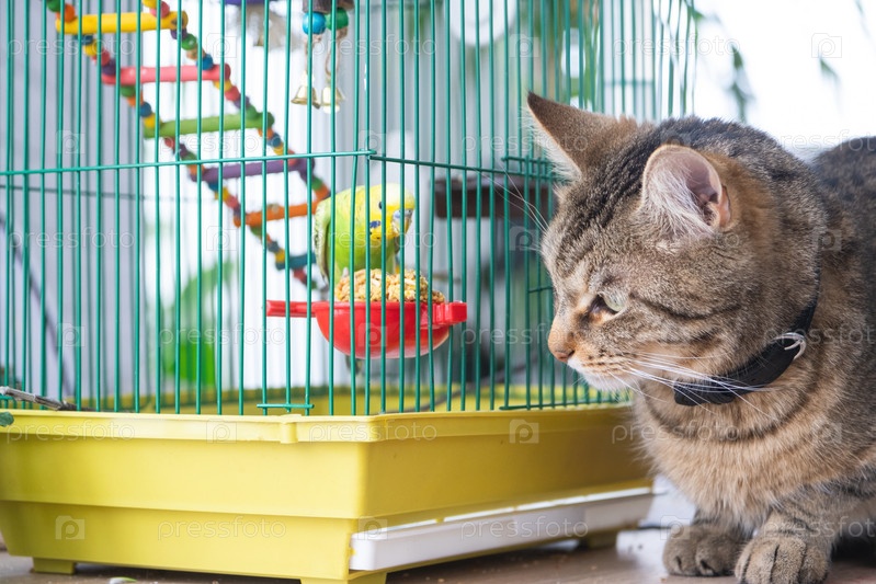 Домашняя кошка сидит возле клетки с попугаем, наблюдает за птицей, охотится. Содержание домашних животных в дружбе и вражде, стресс и общение с домашними животными