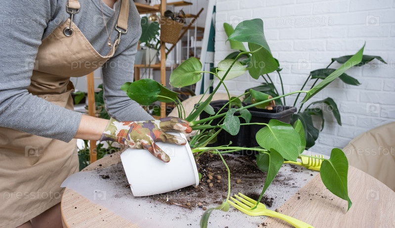 Пересадка домашнего растения Philodendron Monstera deliciosa в новый горшок в интерьере дома.Уход за растением в горшке, руки крупным планом